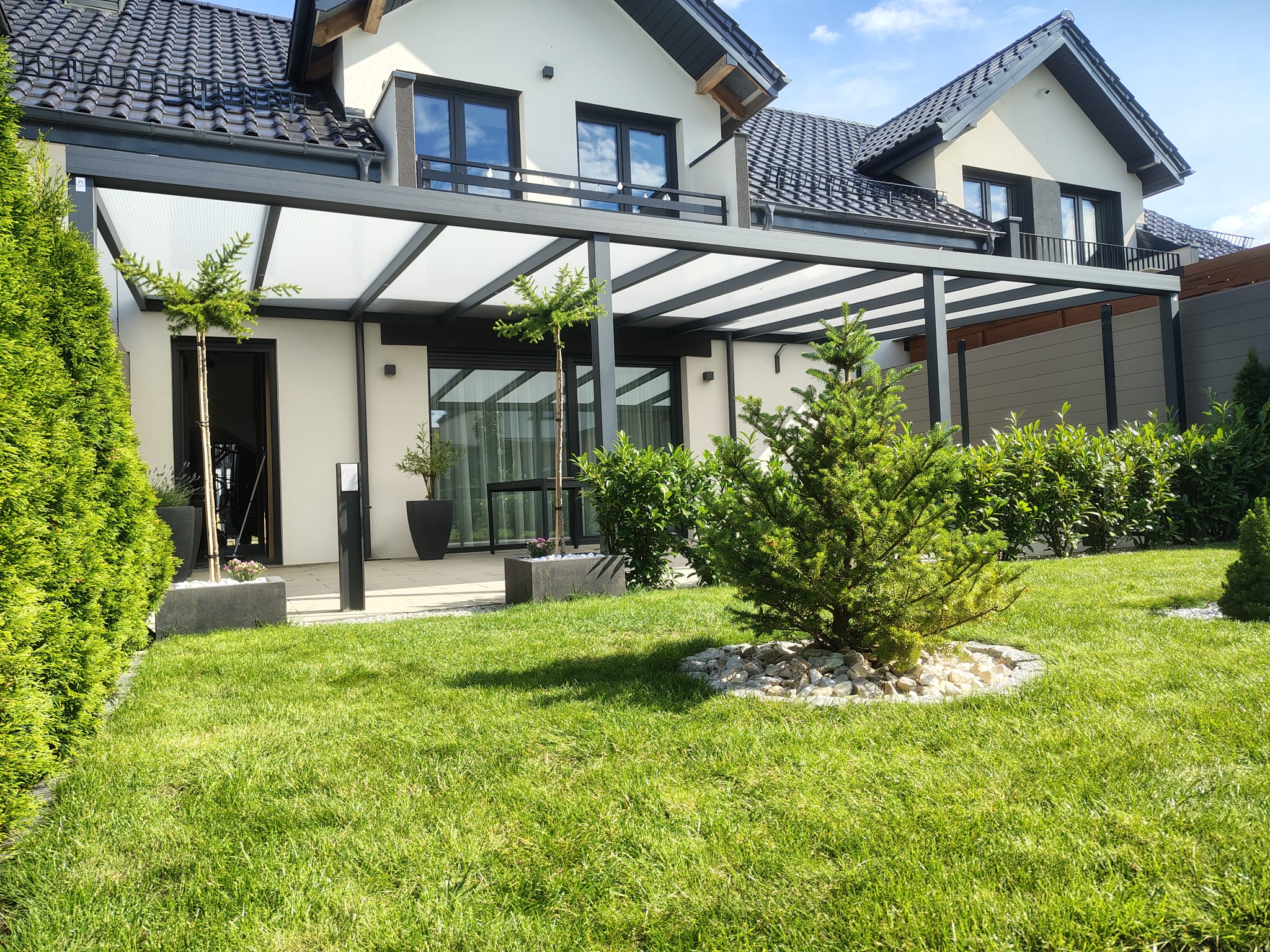 - Dach wykonany z poliwęglanu komorowego 16mm w kolorze mlecznym lub bezbarwnym. Na co to wpływa? Płyty są bardzo sztywne i wytrzymałe. Wszystkie płyty poliwęglanu komorowego